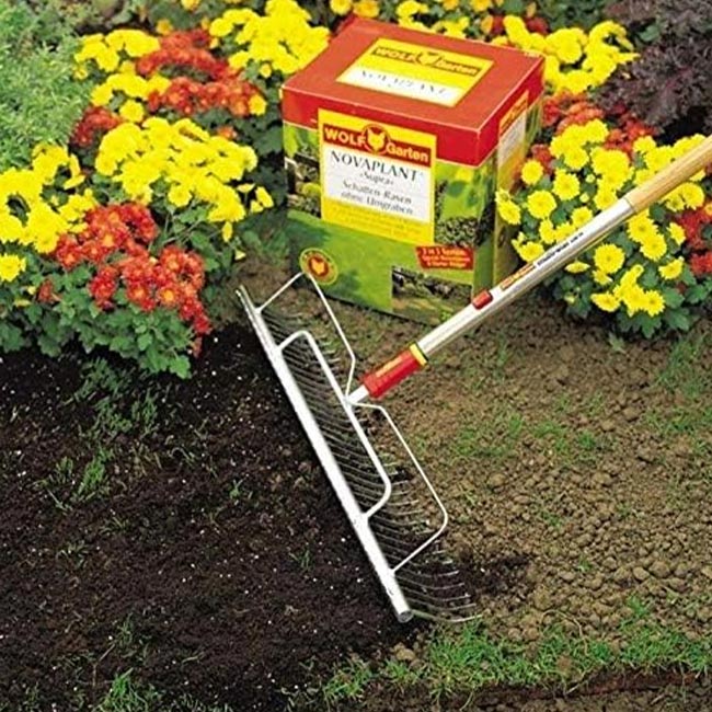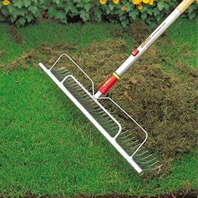 Гребло за трева UH-M 60 от Wolf Garten, необходим и удобен градински инструмент за събиране на окосена трева и листа в градината. С широка работна площ от 58 см и специално оформени зъби, то осигурява плавно движение по тревата без да я наранява. Подходящо е за почистване на големи площи, като същевременно щади гърба ви при работа, особено при отстраняване на плевели с дълбоки корени като глухарчета.