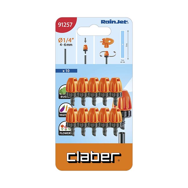 Дюза пръскаща правоъгълна 10бр. Claber за ефективно и целенасочено напояване на градински площи. Снабдена с възможност за директен монтаж към основна тръба 13-16 мм или като крайна точка на тръба 4-6 мм, тя осигурява стабилна струя и равномерно покритие. Комплектът включва 10 броя дюзи, които се монтират лесно и без нужда от допълнителни инструменти. Подходяща е както за домашни, така и за професионални капкови системи.
