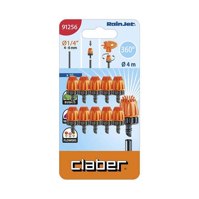 Дюза пръскаща 360о 10бр. Claber за равномерно напояване на кръгли участъци в градината. Комплектът включва 10 броя дюзи, които се монтират директно към основна тръба 13-16 мм или към крайна тръба 4-6 мм. Изработени от устойчиви материали, те осигуряват надеждно разпръскване с лек дъждовен ефект, без да нараняват растенията. Подходящи са за домашни градини, оранжерии и декоративни площи, където се търси прецизно и икономично поливане.