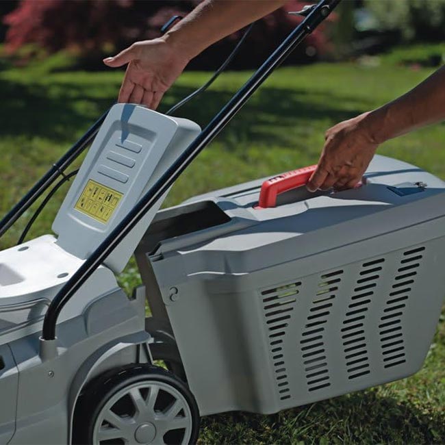 - Кош за трева: 70 л - платнен кош с твърд капак и индикатор за напълване
