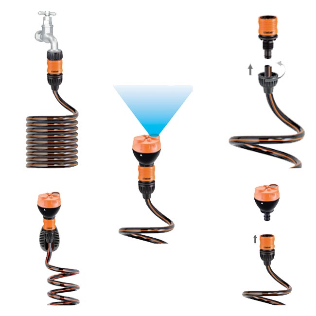 Twiddy е изключително лек и удобен за употреба, без възли, усуквания или прегъвания. Гъвкавите фитинги позволяват свободно движение във всяка посока, а UV устойчивостта осигурява дълготрайност на продукта. Разпръскващата дюза предлага пет режима на струята - душ, мъгла, конус, плоска струя и струя за миене, което го прави идеален за различни задачи в дома и градината, без нужда от допълнителни аксесоари.