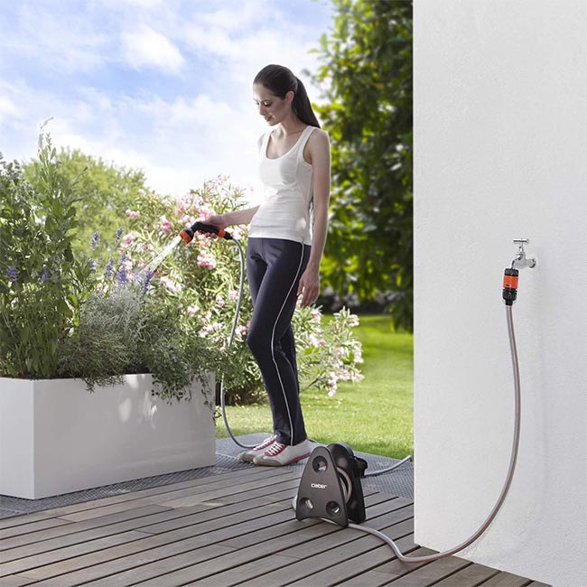 Макарата е произведена от материали, устойчиви на удари и UV лъчи, което осигурява дълготрайност и надеждност при употреба. Стенната конзола с алуминиева ос позволява въртене на 180°, което осигурява лесно следване на движенията на ръката без излишни усилия. Вградената система за заключване против кражба предоставя допълнителна сигурност при монтаж на открито.