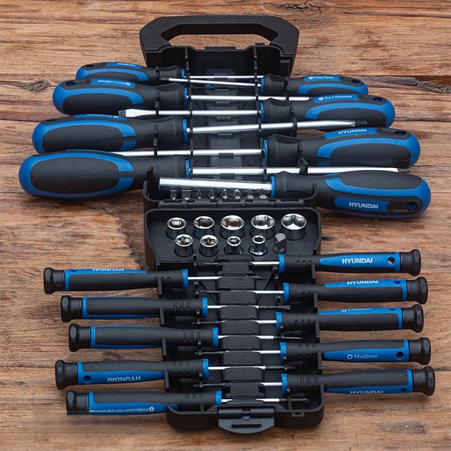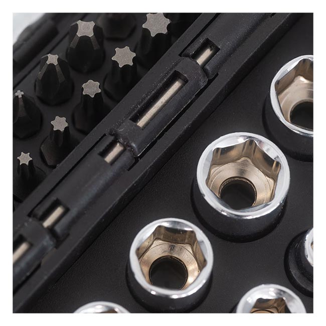 HY59404 предлага богата гама от инструменти, които покриват най-често срещаните нужди при монтаж и ремонт. Отвертките са с различни размери и накрайници, включително прецизни и Torx. Вложките и битовете са подбрани така, че да отговарят на стандартни и специфични задачи. Всичко е подредено компактно, което прави комплекта лесен за съхранение и пренасяне.