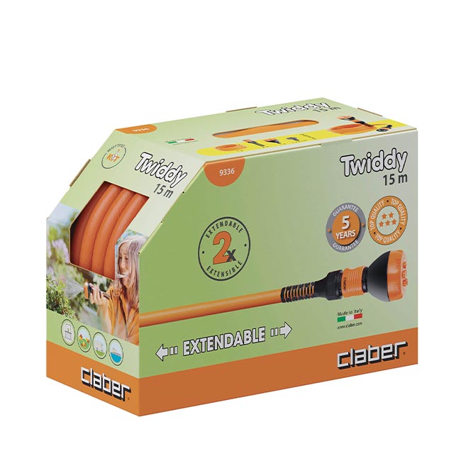 Разтегателен маркуч Twiddy 15м Claber е компактен и лек и създаден за удобство и лесна работа в градината. С дължина от 15 метра при налягане от 3 бара, той се удвоява по време на употреба и се свива обратно след това. Изработен в Италия, в характерните цветове на Claber, този модел е идеален за хора, които търсят практично решение без излишно заемане на място. В комплекта са включени струйник-дюза и свръзки за директно свързване към крана.