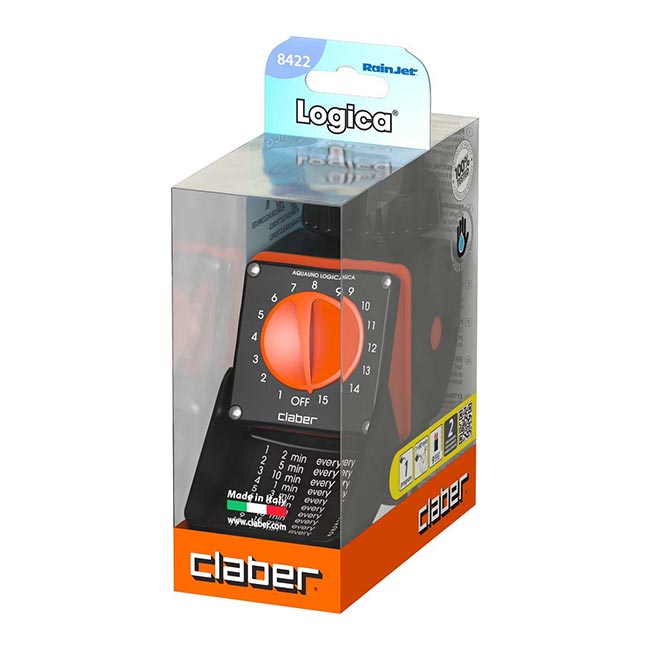 Таймер за вода Aquauno Logica Claber е практично решение за автоматизирано поливане, което не изисква сложни настройки. Създаден за удобство, той предлага 15 предварително зададени програми, които се избират само чрез завъртане на копчето. Данните за всяка програма са отпечатани на капака, което прави управлението интуитивно и лесно. Устройството е подходящо за тераси, градини и зеленчукови лехи, като осигурява надеждно напояване всеки ден.