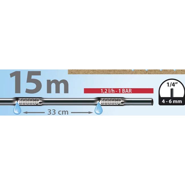 тръба с капкообразуватели 4-6мм. 1.2л.ч 15 Claber е надежден избор за всеки, който търси ефективно и устойчиво решение за капково напояване. С лесен монтаж, висока издръжливост и оптимално разпределение на водата, тя е подходяща за всяка градина.