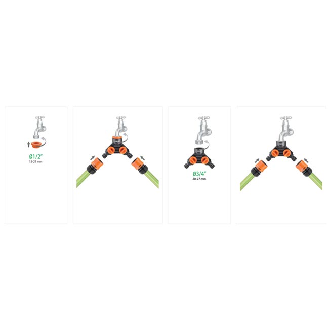 Claber 8599 позволява едновременно свързване на два маркуча към един кран. Подходящ е за домашни и професионални поливни системи.