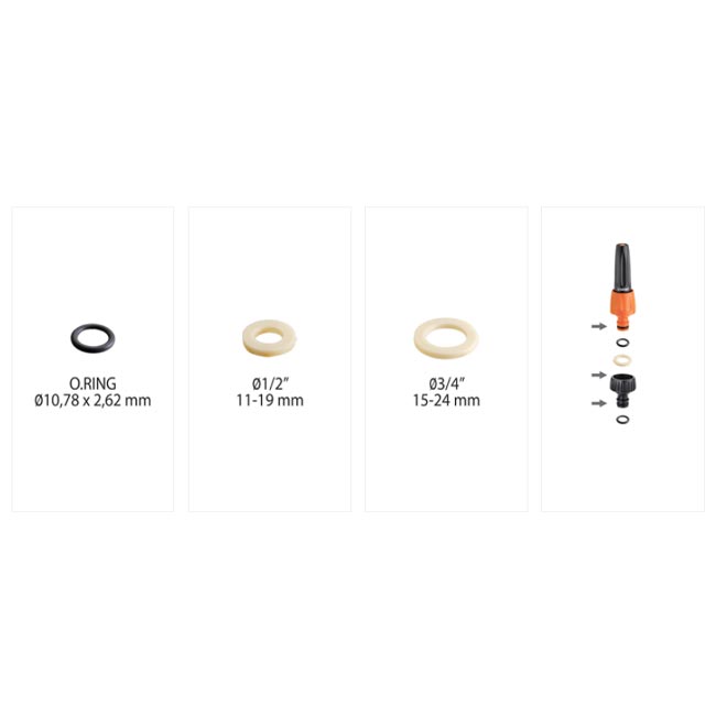 Комплектът е предназначен за уплътняване на връзки в надземни поливни системи. Подходящ е за съединители, пистолети и пръскачки.